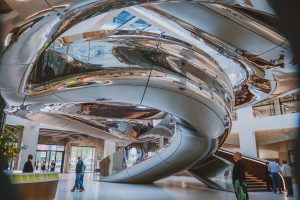 این نوع طراحی نشاندهنده قدرت متریال فلز در اجرای پروژههای بزرگ و دکوراتیو است و به بازدیدکنندگان تجربهای متفاوت از معماری ارائه میکند.