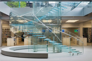 این پلکان که بهطور کامل از شیشه ساخته شده، شامل ۴۳ کفپله کنسولی (بدون تکیهگاه زیرین) است که به شکلی روان و پیوسته بالا میروند و توسط یک استوانه شیشهای شناور پشتیبانی میشوند.