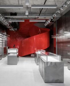 فروشگاه دیزل که در میامی قرار دارد، دارای یک راهپله مارپیچ قرمز رنگ است که در عین کاربردی بودن، جلوهای هنری دارد. این پلکان، با استفاده از فولاد رنگی طراحی شده که در تضاد کامل با فضای داخلی فروشگاه قرار میگیرد. استفاده از رنگ و فرم جسورانه باعث شده این پلکان به نقطه کانونی برجستهای تبدیل شود و زیبایی کلی فضا را ارتقا دهد. طراحی این پله بهصورت مجسمهوار انجام شده و ترکیبی بینقص از فرم و عملکرد را به نمایش میگذارد، بهگونهای که این پلکان صرفاً یک مسیر ارتباطی بین طبقات نیست، بلکه بهعنوان یک اثر هنری تعاملی عمل میکند که روحیه سرکش برند دیزل را بهخوبی به تصویر میکشد.