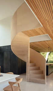 این پلکان از چوب لایهای سبک ساخته شده و انحناهای نرم و ارگانیک آن در تضاد چشمگیری با خطوط مستقیم فضای داخلی قرار دارند؛ و این تضاد، احساسی از حرکت و پویایی را القا میکند.