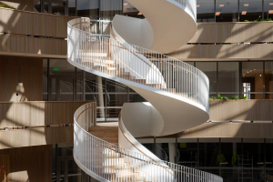 پلکان مارپیچ ساختمان فورسکارن، طراحیشده توسط گروه دانمارکی ۳XN Architects، شاهکاری معماری در قلب طرحی با محوریت آتریوم باز بهشمار میرود.